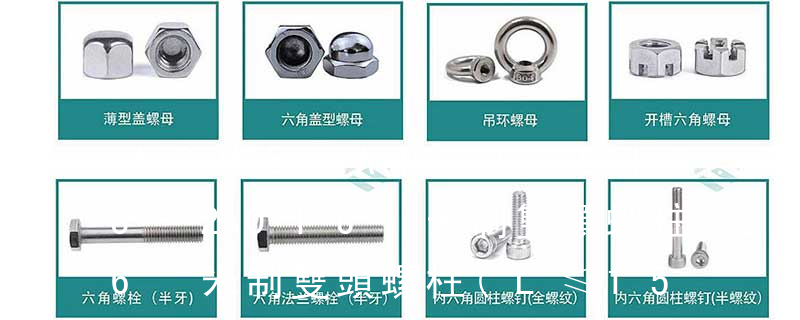 全螺紋)、HG/T20634(全螺紋)、HG/T20613(全螺紋)、JB/T4707(等長雙頭)、SH/T3404、NB/T47027(A、B、C型)、DIN938、DIN939、IFI136、ASMEB18.31.1M(米制)、ASMEB18.31.2(英寸)、按圖非標雙頭等。